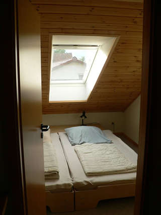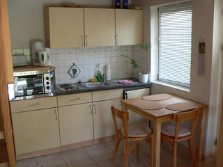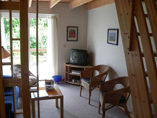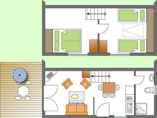 Die kleine Ferienwohnung verfügt im EG über 1 Wohnraum mit Küchenzeile und Geschirrspüler, sowie über ein Duschbad mit WC und einem Abstellraum. Im OG sind 2 aneinander grenzende Schlafräume vorhanden, d.h. der hintere Schlafraum ist nur über den vorderen zu erreichen.